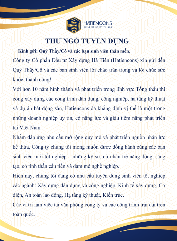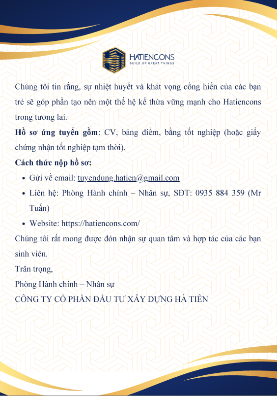 Công ty CP Đầu tư Xây dựng Hà Tiên (HATIENCONS) thông báo tuyển dụngĐược đăng: Thứ hai, 27 Tháng 10 2025 13:53