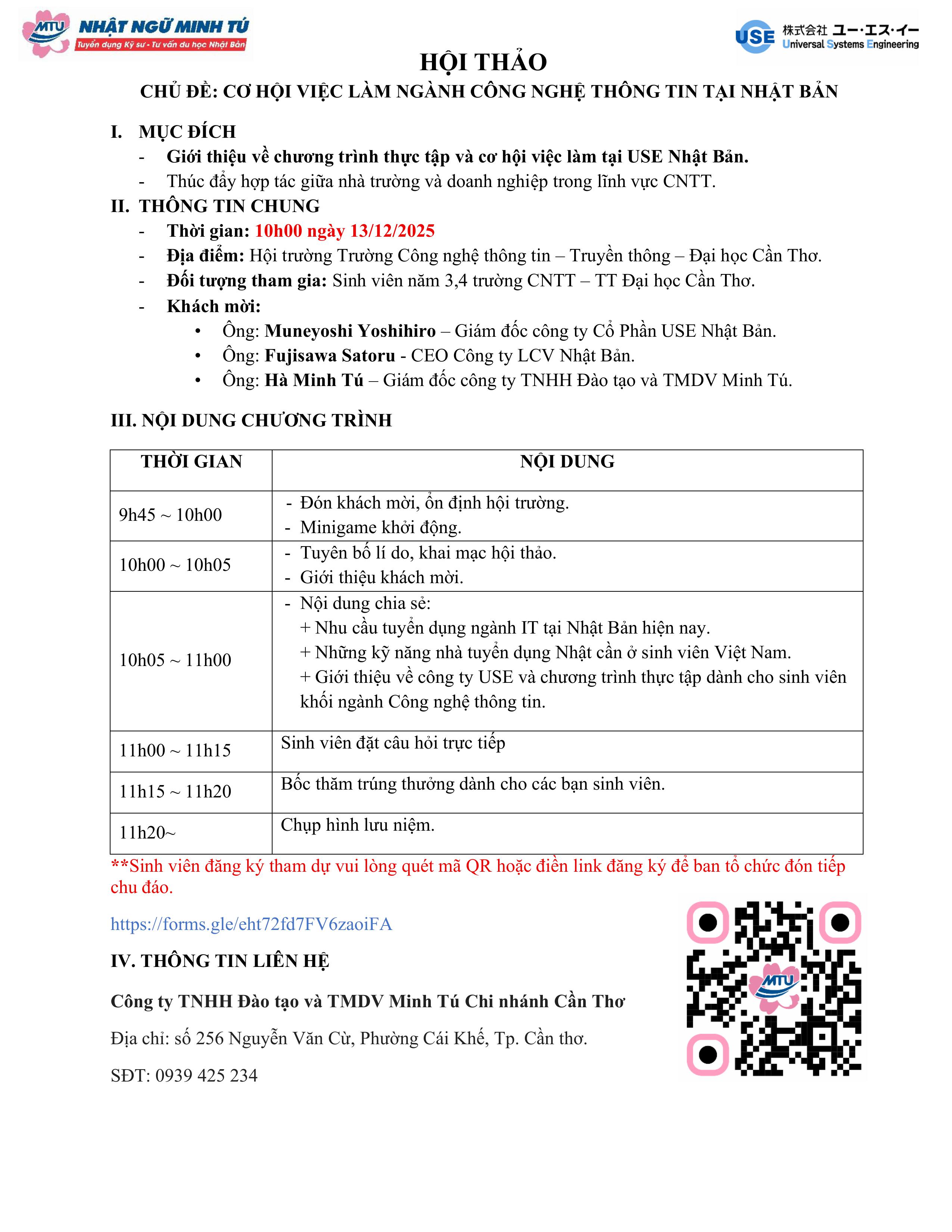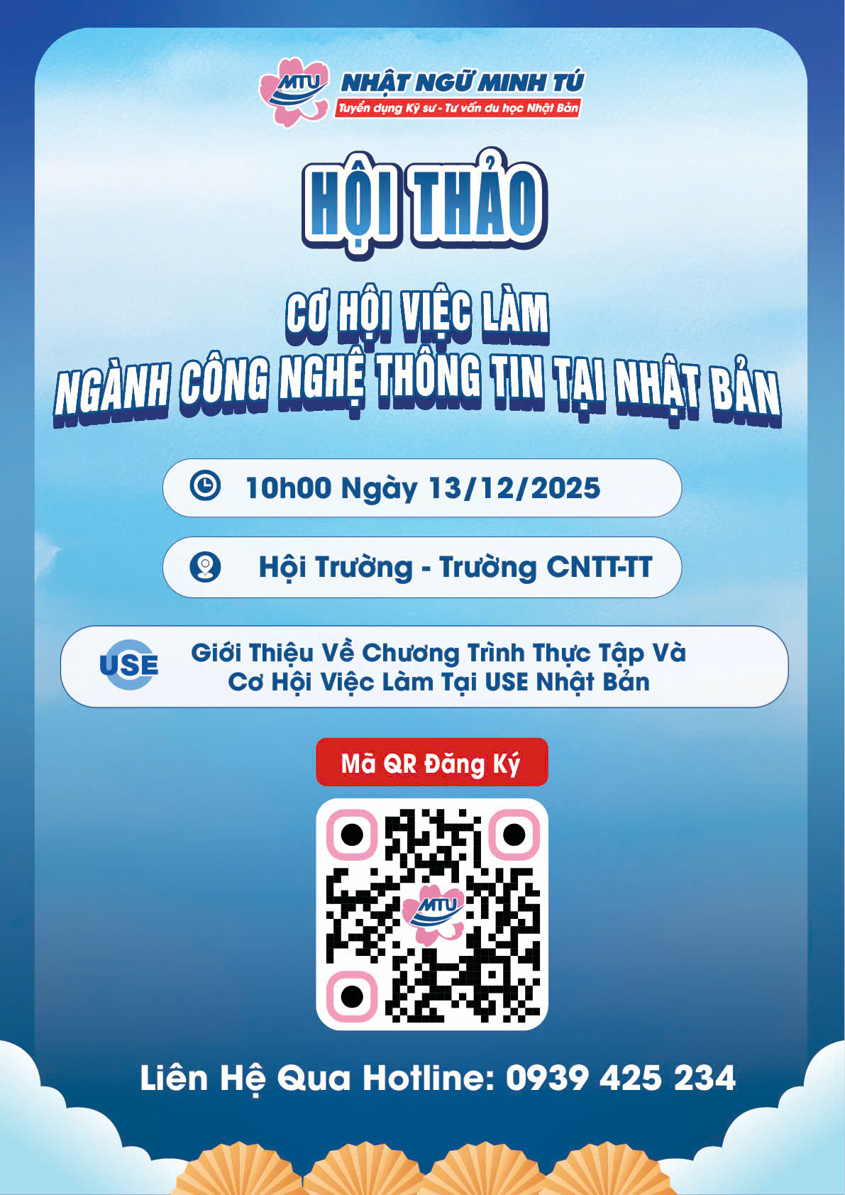 Nhật ngữ Minh Tú thông báo tổ chức Hội thảo cơ hội việc làm ngành công nghệ thông tin tại Nhật BảnĐược đăng: Thứ sáu, 28 Tháng 11 2025 08:36