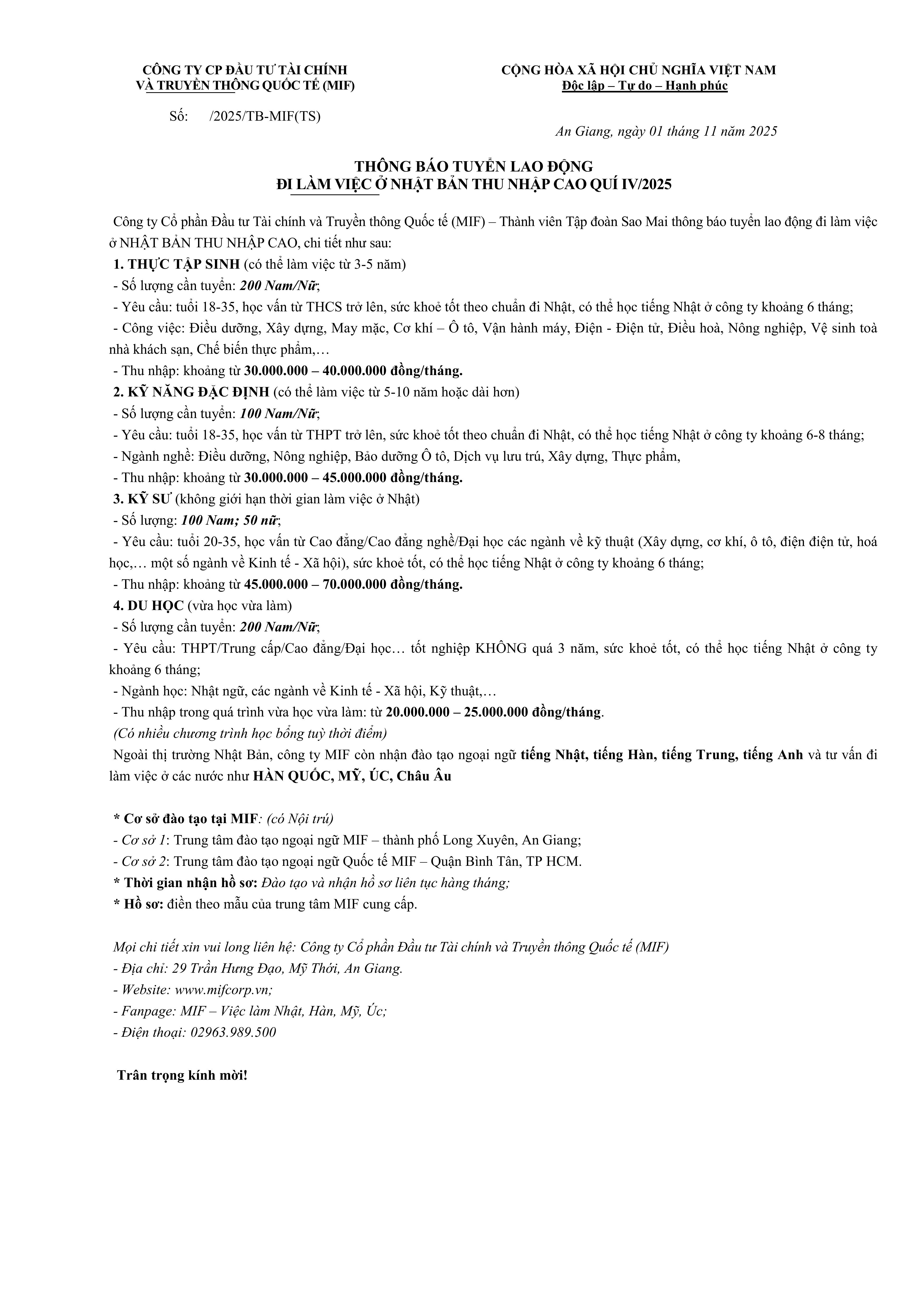 Công ty CP Đầu tư Tài chính & Truyền thông quốc tế (MIF) thông báo tuyển dụngĐược đăng: Thứ ba, 04 Tháng 11 2025 10:06