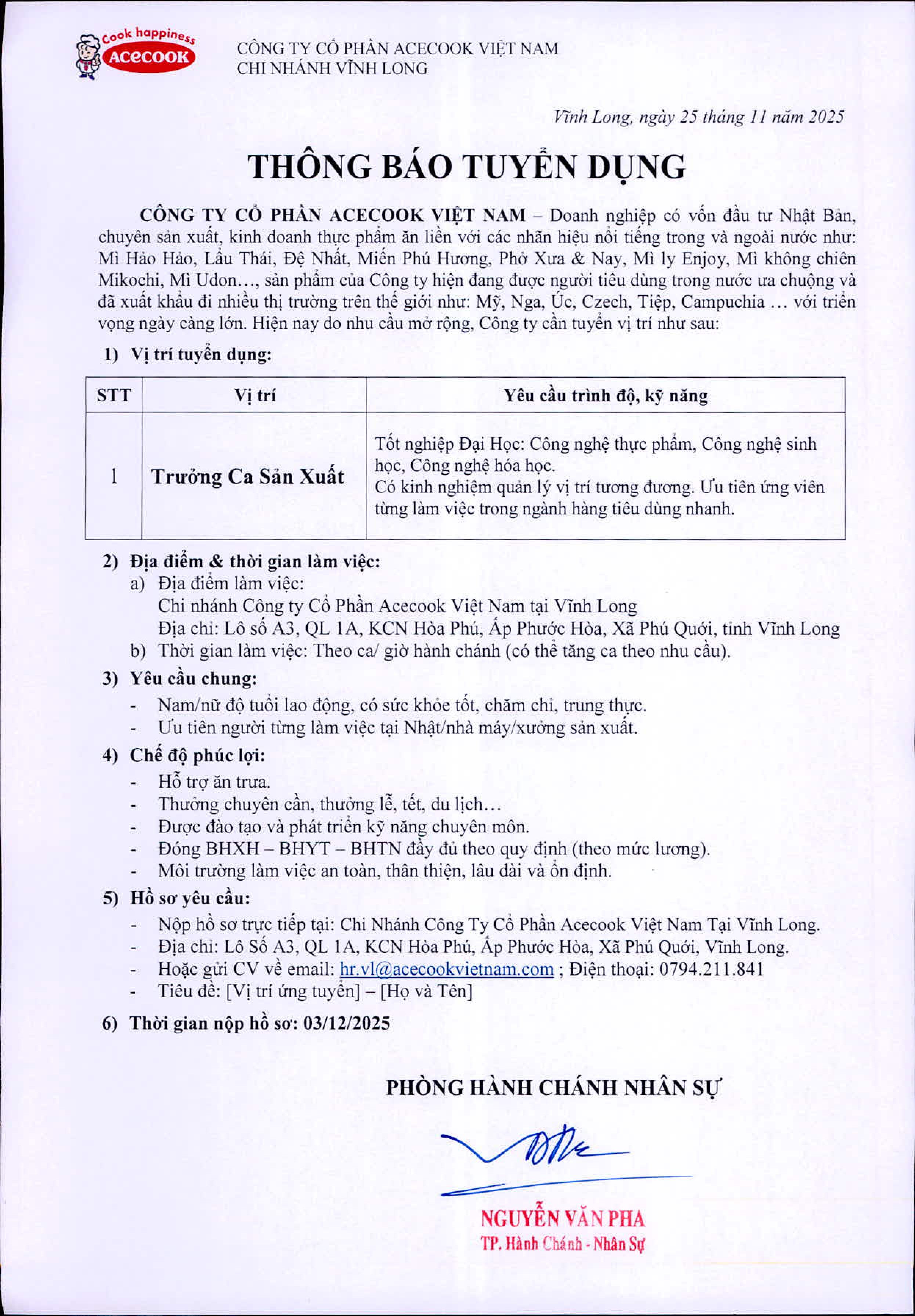 Công ty CP ACECOOK Việt Nam thông báo tuyển dụng