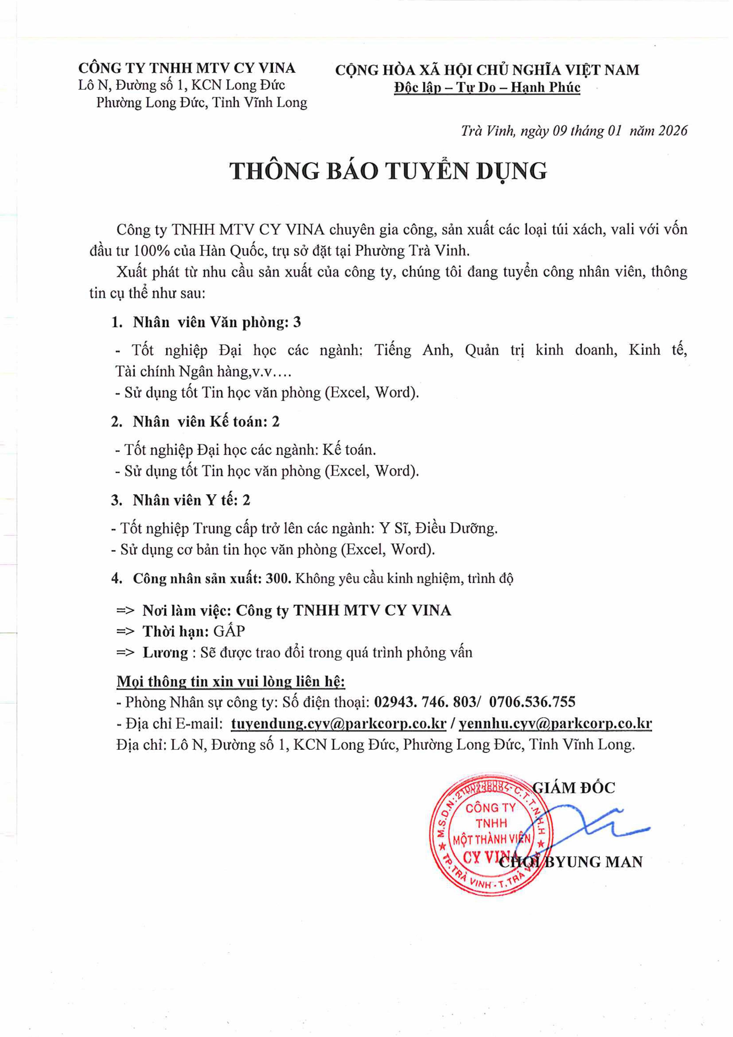 Công ty TNHH MTV CY VINA thông báo tuyển dụng