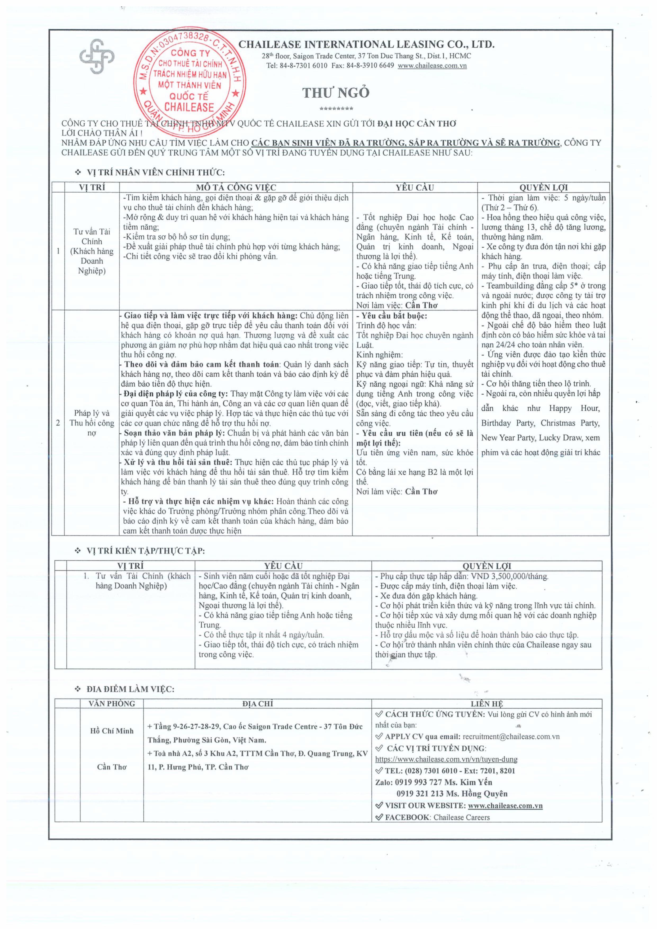 Công Ty Cho Thuê Tài Chính Quốc Tế Chailease thông báo tuyển dụngĐược đăng: Thứ tư, 14 Tháng 1 2026 08:05