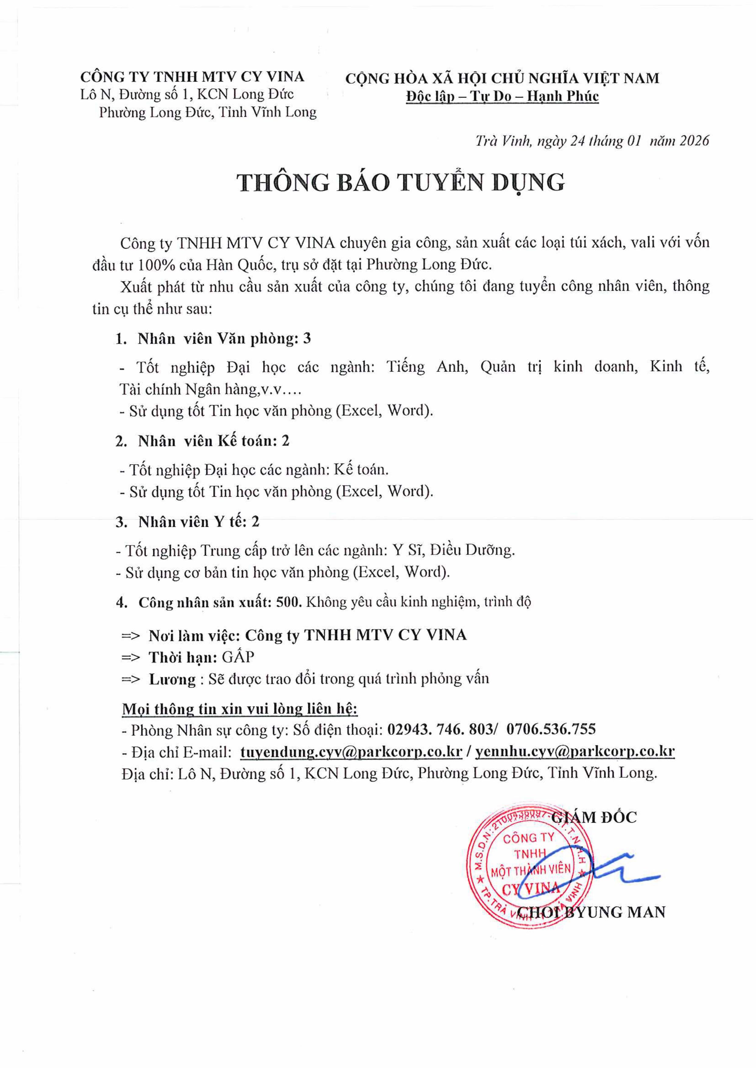 Công ty TNHH MTV CY VINA thông báo tuyển dụng