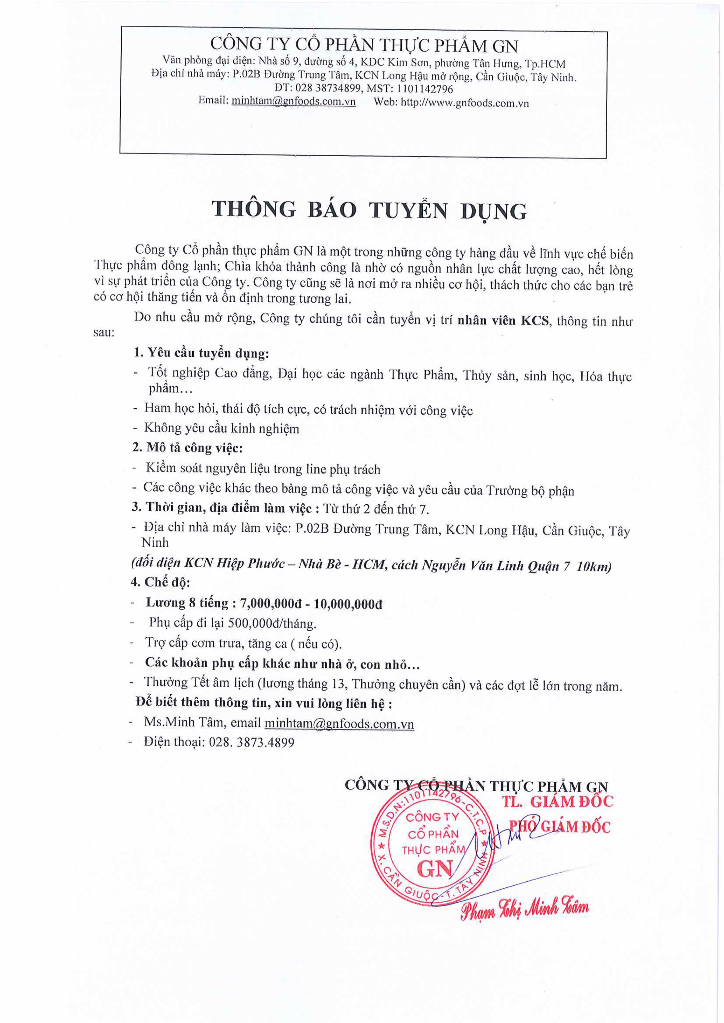 Công ty Cổ phần Thực phẩm GN thông báo tuyển dụng